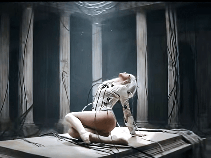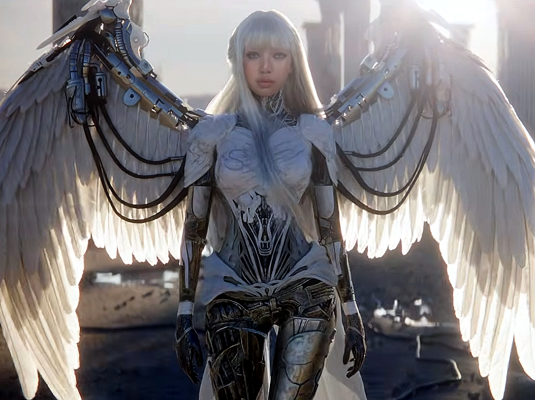 The music makes little sense without the accompanying music video. You can’t have Anyma music without the Anyma vista. Just as Lisa’s voice is processed until metallic, her image in the video is staged in cybernetic ruins. The machine‑angel-hybrid-as-白发魔女 (baifa monu, white-haired demon) sleeps on a catafalque, or for Asians who enjoy anything by 金庸 (Jin Young), what could pass off as 小龙女 or Xiao Long Nu’s 寒玉床 (hanyuchuang) or cold jade bed that has the amazing effects in assisting in the cultivation of qi, calming the mind and spirit, beautifying the skin, and clearing heat. At the beginning of the video, the bad angel awakens. And then she is restored her full energy and consciousness, but not from the magical powers of a stone bed, but through tubes connected to her leotard, rather than her skin or any entry point of her body. The bad angel clearly doesn’t have a spirit to calm, but a battery to recharge. Lisa was probably too busy to sit through half a day of make-up; she is operating on a schedule where blending refers to strategic alliances, not making her skin a zone to plug in. She moves on that bed or slab, as if a visual-language-action model, exposing her bare rump like a knowing sex doll. Bad Angel, you bet.