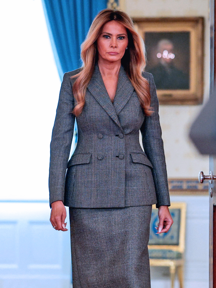 Even that suit did not make a first-time appearance then. It was reportedly used for a shoot for a profile with the European media prior, and also worn to other close-door events. It is impressive enough that Mrs Trump recycles her sartorial choices. But media reports are emerging that she wore Dolce & Gabbana for that White House announcement. If that is correct, it would, no doubt, be on-brand for her. Her supporters (mainly her husband’s supporters) say she is “consistent”. So was Barbara Bush. To be sure, the tailoring was impeccable—much easier to keep the accent charming when your collar was reinforced by Italian wool. But, whether it was Prada’s clinical intellectualism or a Dolce & Gabbana cinched defence, the intent was the same: to project a silhouette of stability where the message was reactive. Both suits were double-breasted with pronounced lapels; both in the grey of battleships. She wears no shirt beneath, no jewellery. By stripping away the glitter of the traditional first lady—the pearls, the silk blouses—she creates a look that was entirely functional and severe. It was less an outfit than a uniform for a high-stakes deposition. Both looks comprised single outers that were sufficient shields against the scrutiny she had long dodged with admiral-like persistence. The formal outfit and the formal foyer with the nation’s flags signalled a state institution defending its borders, rather than a wife defending a marriage.